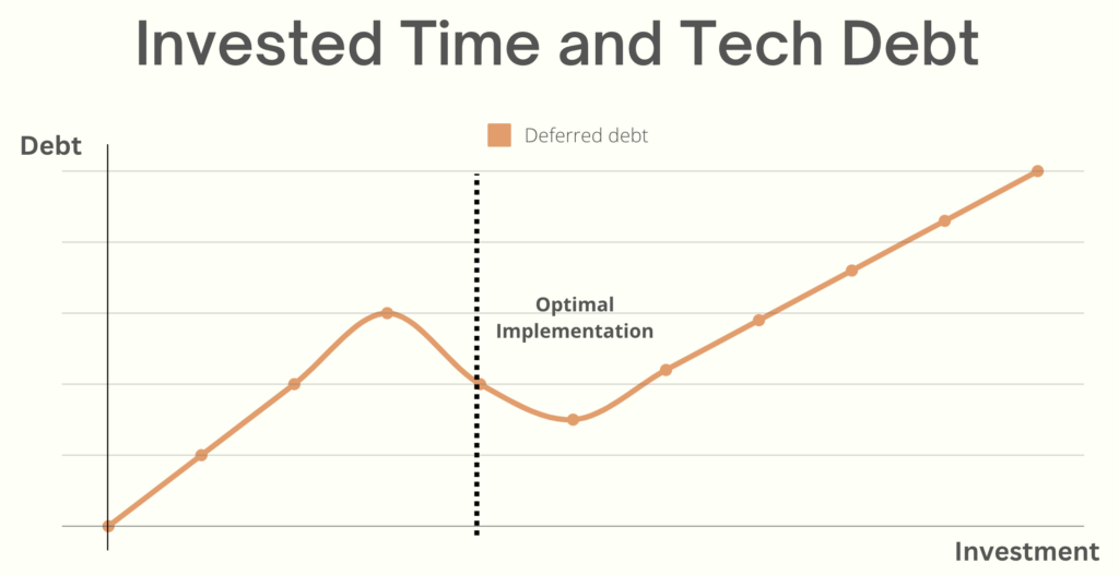 In the beginning of the implementation, some prototyping will typically be done with very limited debt created. Then, if the implementation is done quick and dirty without any guardrails, principles, or guidance, the engineer will be done at the first maximum. The entire implementation will be technical debt as everything is likely to have to be written from scratch to be integrated into the rest of the product and ready for scaling. However, if you have the right guardrails, principles, and guidance in place, the engineers will optimise implementation based on these. Implementation time will be slightly longer, but you are ready for enhancements and scaling.