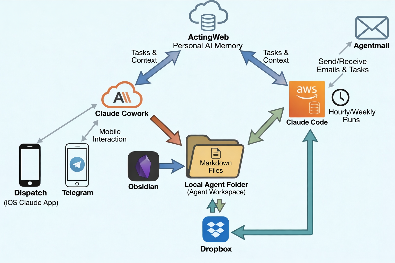 The center of my setup is the local agent folder with markdown files that includes instructions to Claude, as well as a structure for the agent’s work. I use Obsidian as an editor and viewer for this workspace, and as a simple way to interact with the agent (make decisions on actions it has flagged, write new tasks, etc). By using the scheduling functionality in Claude Cowork, you already have a working agent. If you want to play with various ways of interacting from your mobile with the agent, you can either use Dispatch (in Claude Cowork) and your Claude iOS app or you can experiment with the channels functionality and use Telegram.
