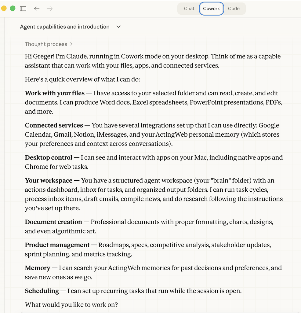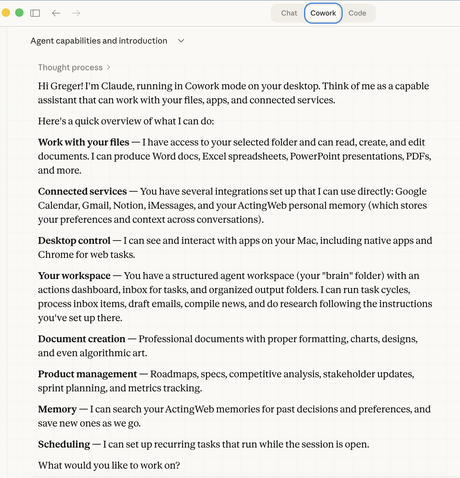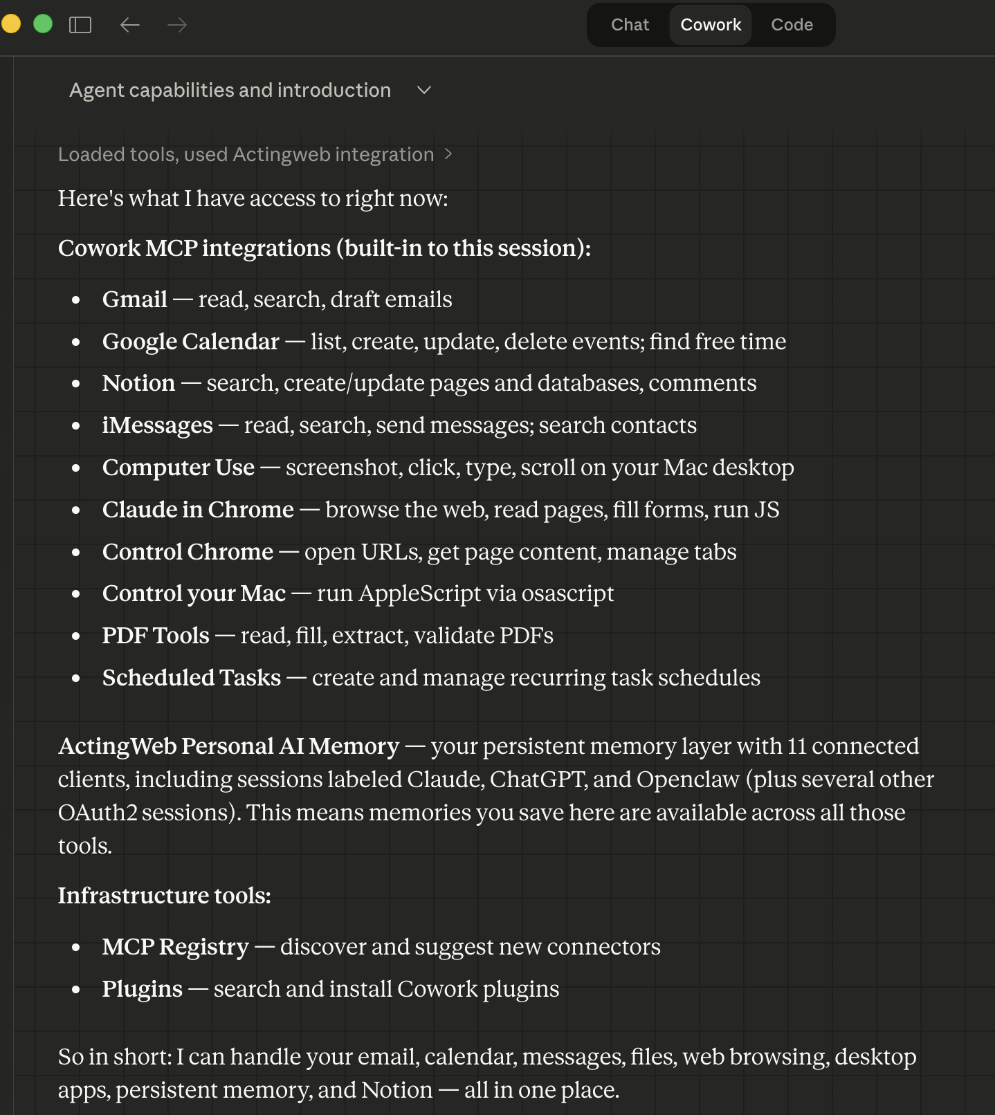 A couple of things worth mentioning from Claude's response above: The central piece is really the "structured agent workspace". It contains instructions to Claude on how to behave and what to do as an agent. The workspace consists of a bunch of markdown documents stored locally on disk, and I just point Claude Cowork to the folder. In addition, the agent has access to a centralized, personal memory system called ActingWeb. More static, slow-evolving facts live in the markdown files, but ActingWeb has semantic search so the agent gets more tailored context when querying for relevant information. The agent works without ActingWeb, but gives you more personalized results with it.