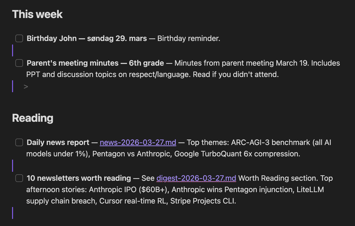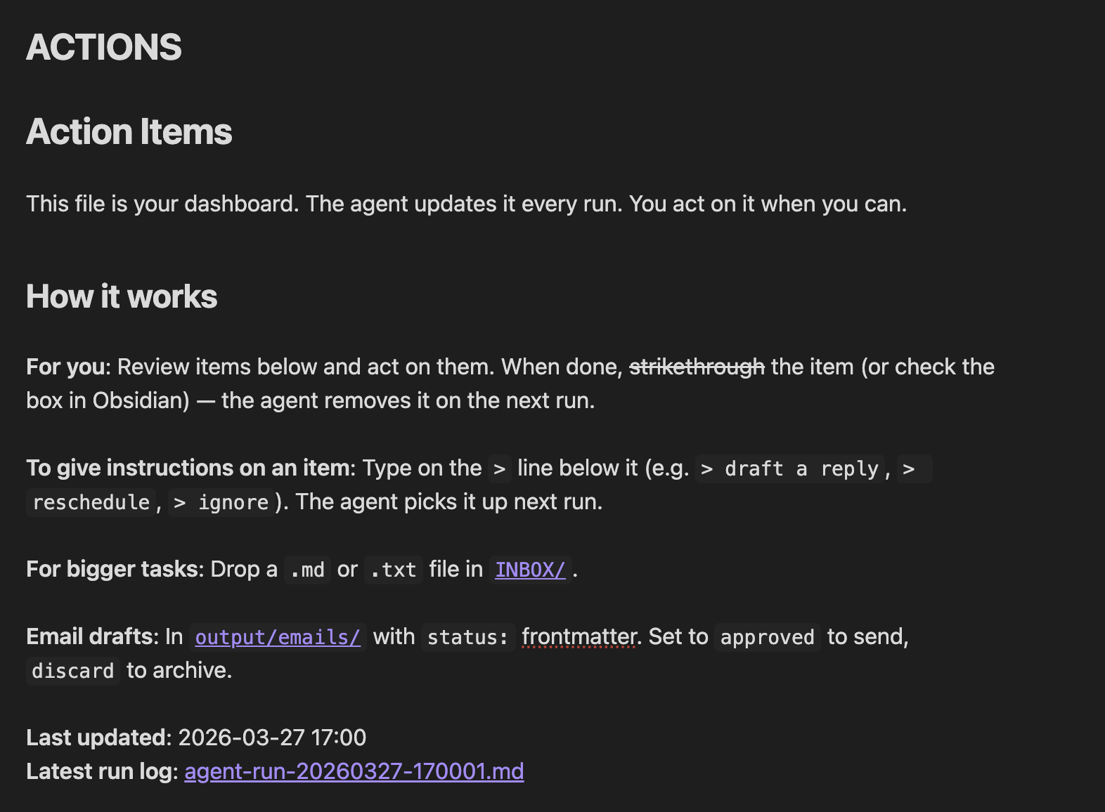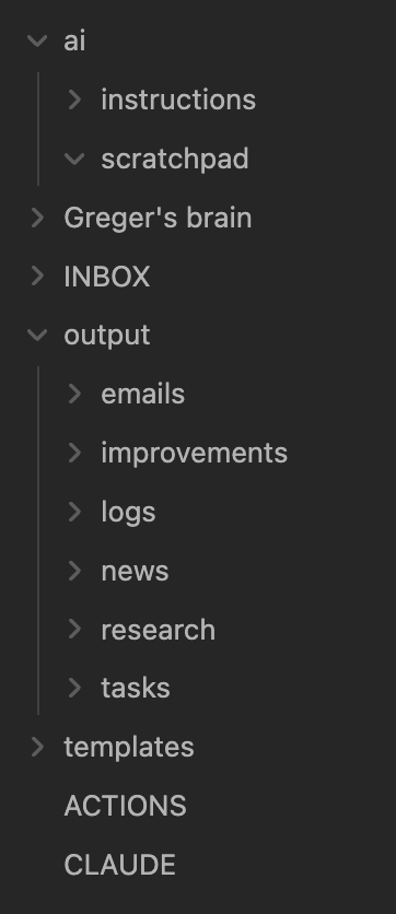 As you can see, it’s fairly simply. The CLAUDE.md file and the ai folder contain all the instructions to the agent, then there’s an INBOX for the agent, an output folder where the agent puts what it has done, and a template folder that contains templates for different types of documents. And the most important file: the ACTIONS.md that acts as a dashboard for you and where the agent puts all actions. “Greger’s brain” are just my own folder structure with documents I want to keep.