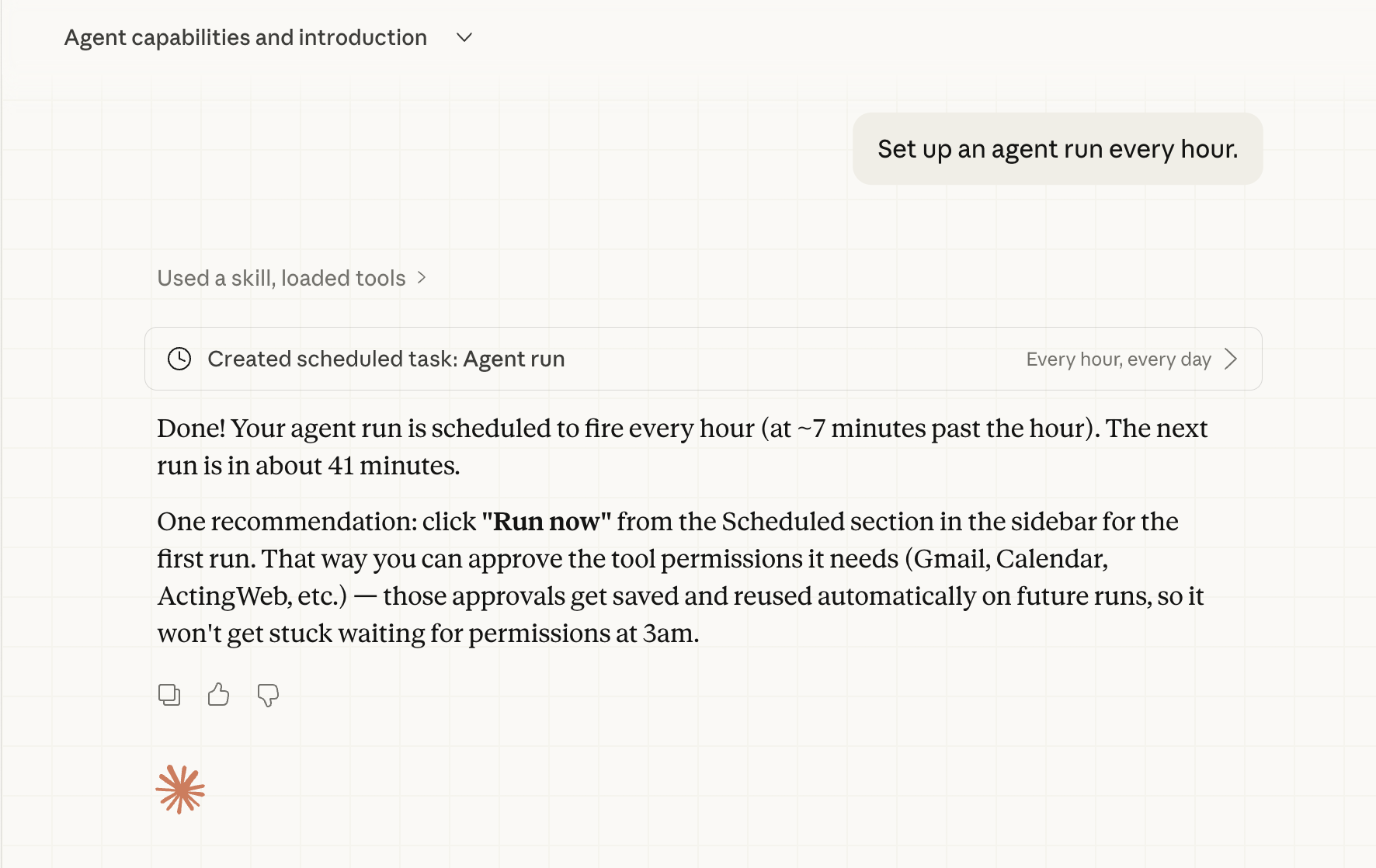 I can ask Claude to either schedule an agent run every X minutes, or ask it to do a manual run. In the video below, I ask it what it will do for every task run.