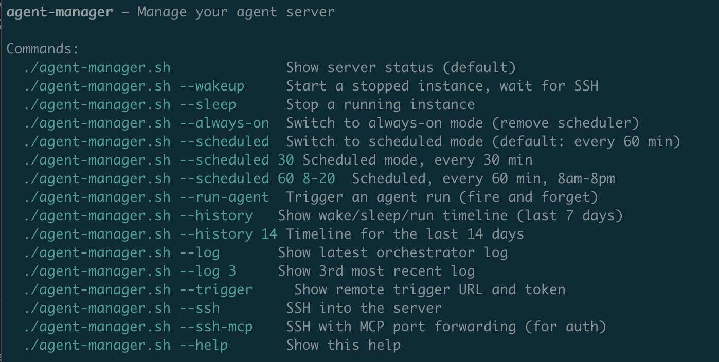 If you choose to set up the AWS server, Claude (or you directly from the command line) can use the agent-manager.sh to control the AWS server. Claude will help you install the aws cli tool that is necessary as part of the installation. The folder where Claude put the Github repository will contain the agent.conf file that configures your server and the deploy-state.json file that contains details about what has been set up in AWS. This means that Claude can also run the agent-manager.sh for you.