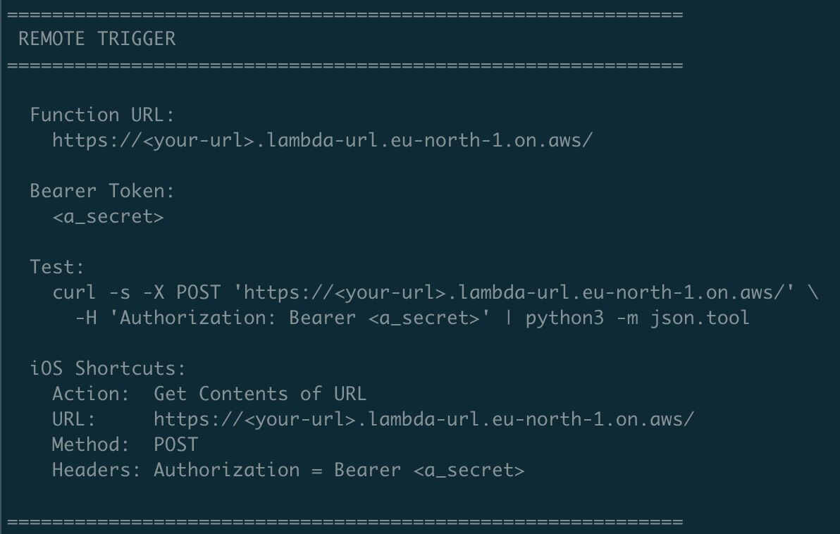 Another neat thing is that you can install a simple way to trigger the agent to run. deploy-trigger.sh sets up a protected web trigger that can easily be added as an iOS shortcut, so you can run the agent any time you want.