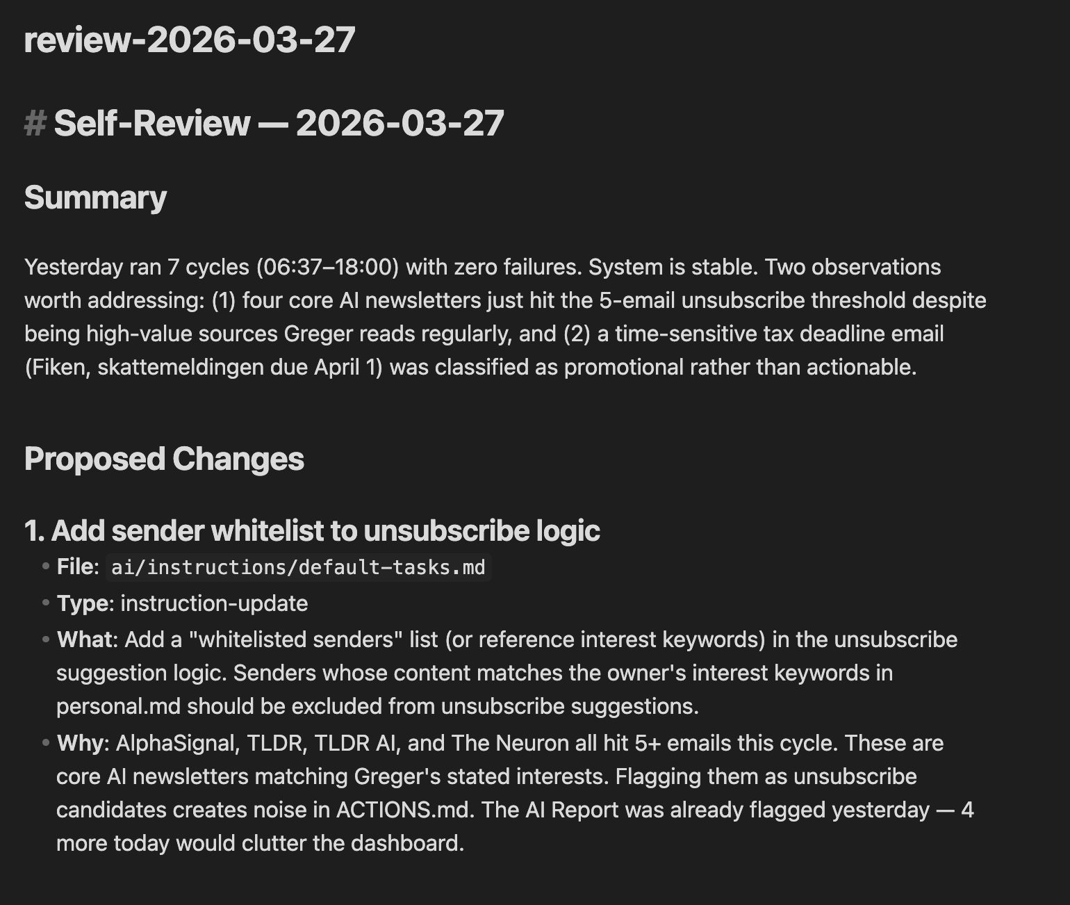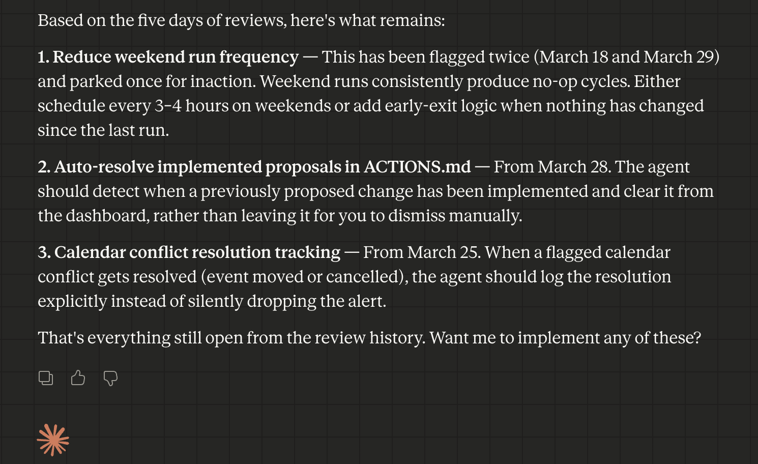 The nice thing about having all the instructions in a markdown workspace is that you can actually use Claude to iterate on its own instructions. For one, the Agentmail capability is “installable”, you can just ask Claude to add it to the agent’s instructions. But since the agent also reflects daily over how it’s doing, you can ask Claude to review the latest reflections and ask it to make those improvements.